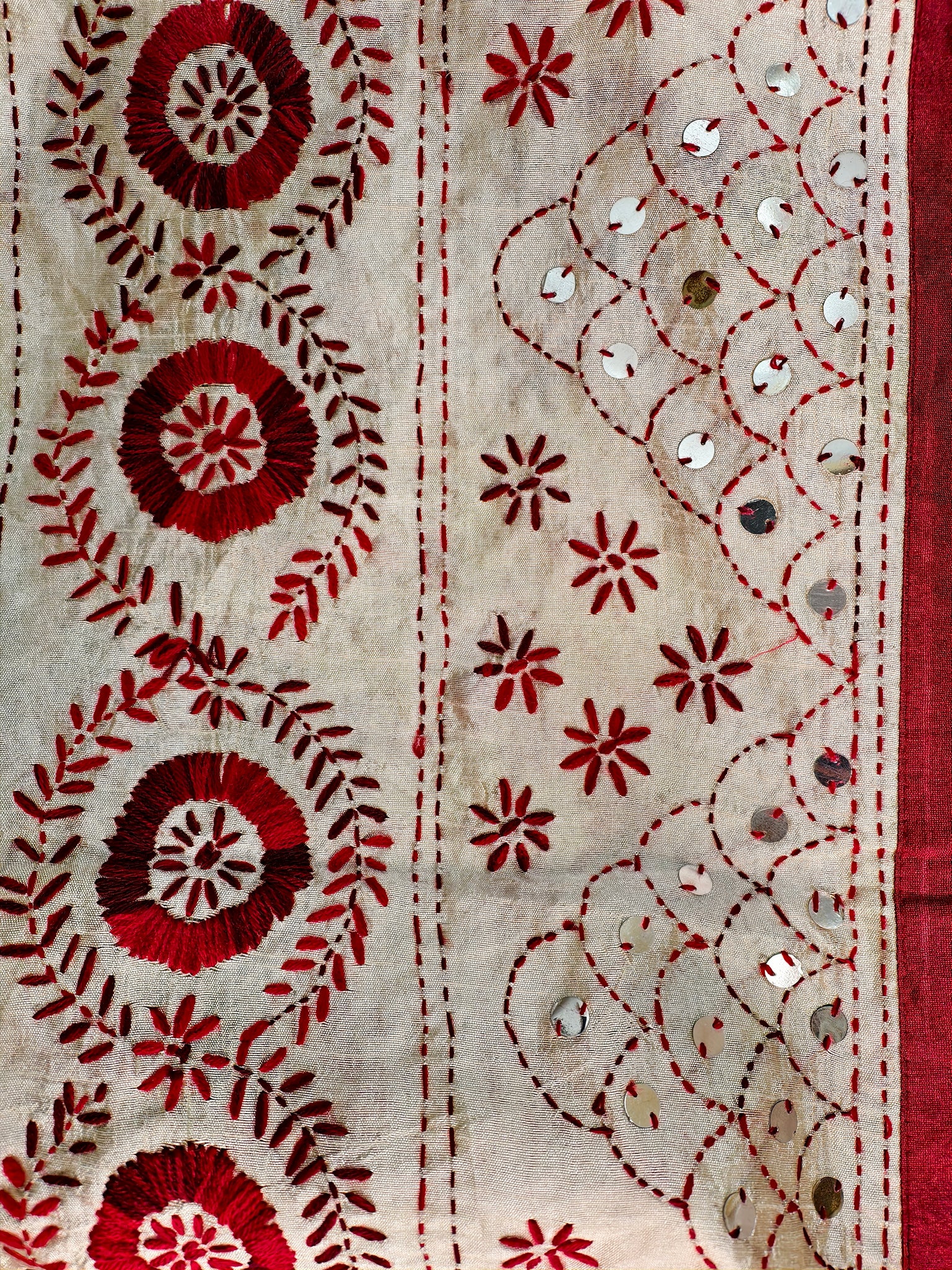 Handcrafted Charm: Cream Tussar Silk Dupatta with Maroon Kantha Work & Sequins