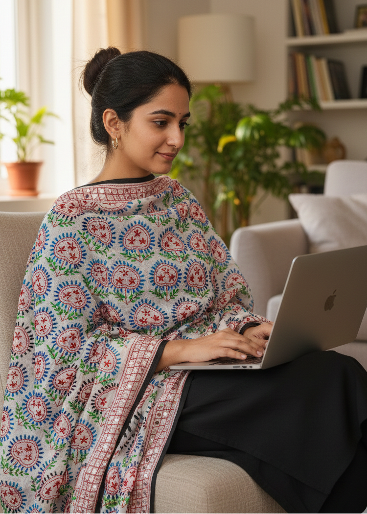Beautifully detailed with phulkari-inspired hand embroidery and subtle mirror highlights, this soft ivory dupatta brings color and texture to your look. Perfect for pairing with kurtas, suits, or fusion outfits across seasons.