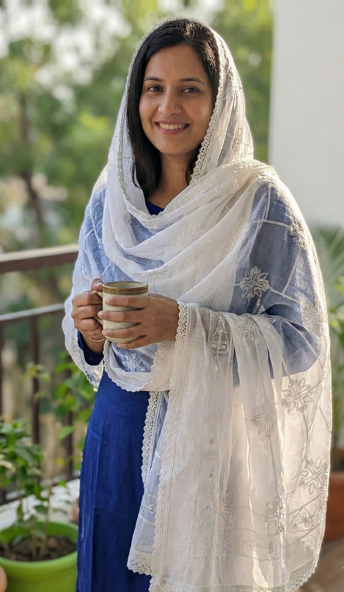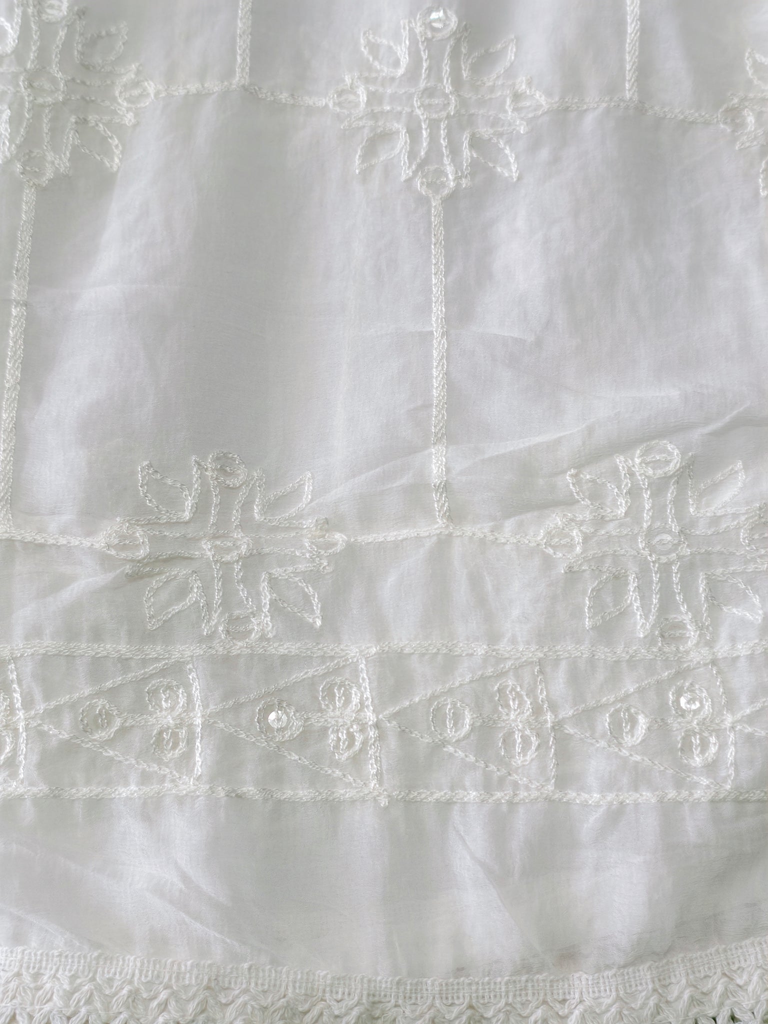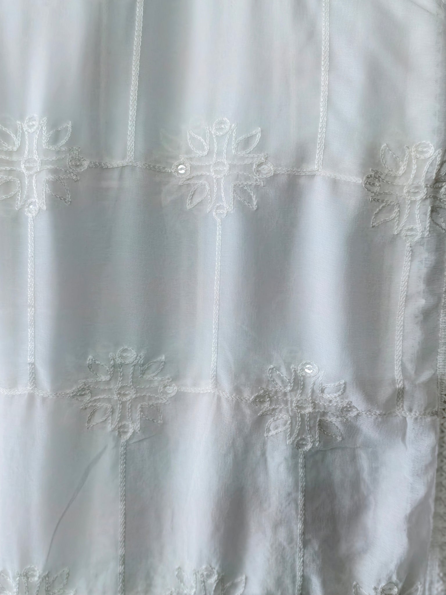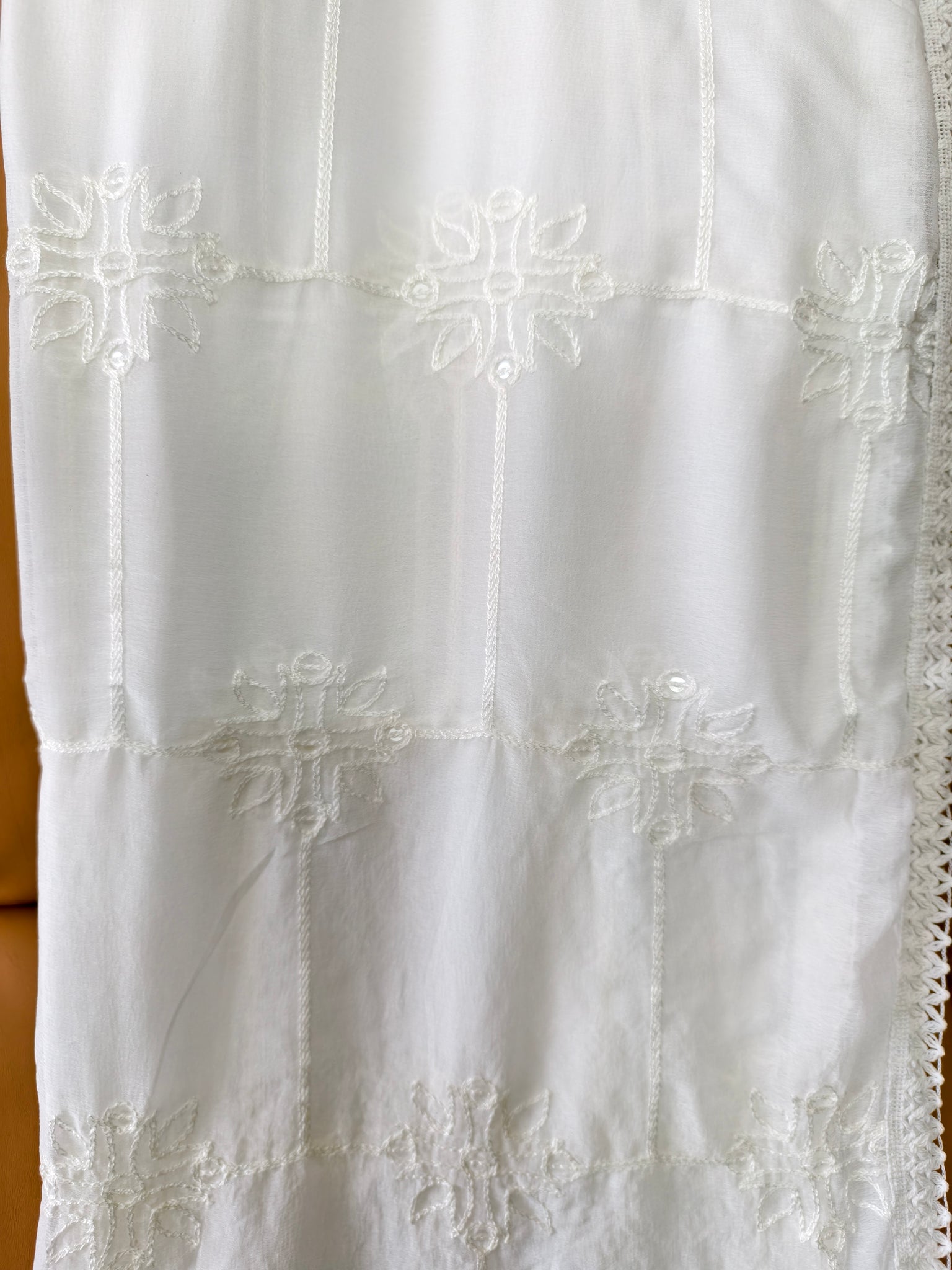 Graceful, airy, and timeless. This exquisite dupatta is designed for the woman who prefers understated luxury. The translucent fabric offers an ethereal drape, while the intricate white needlework provides depth and texture.