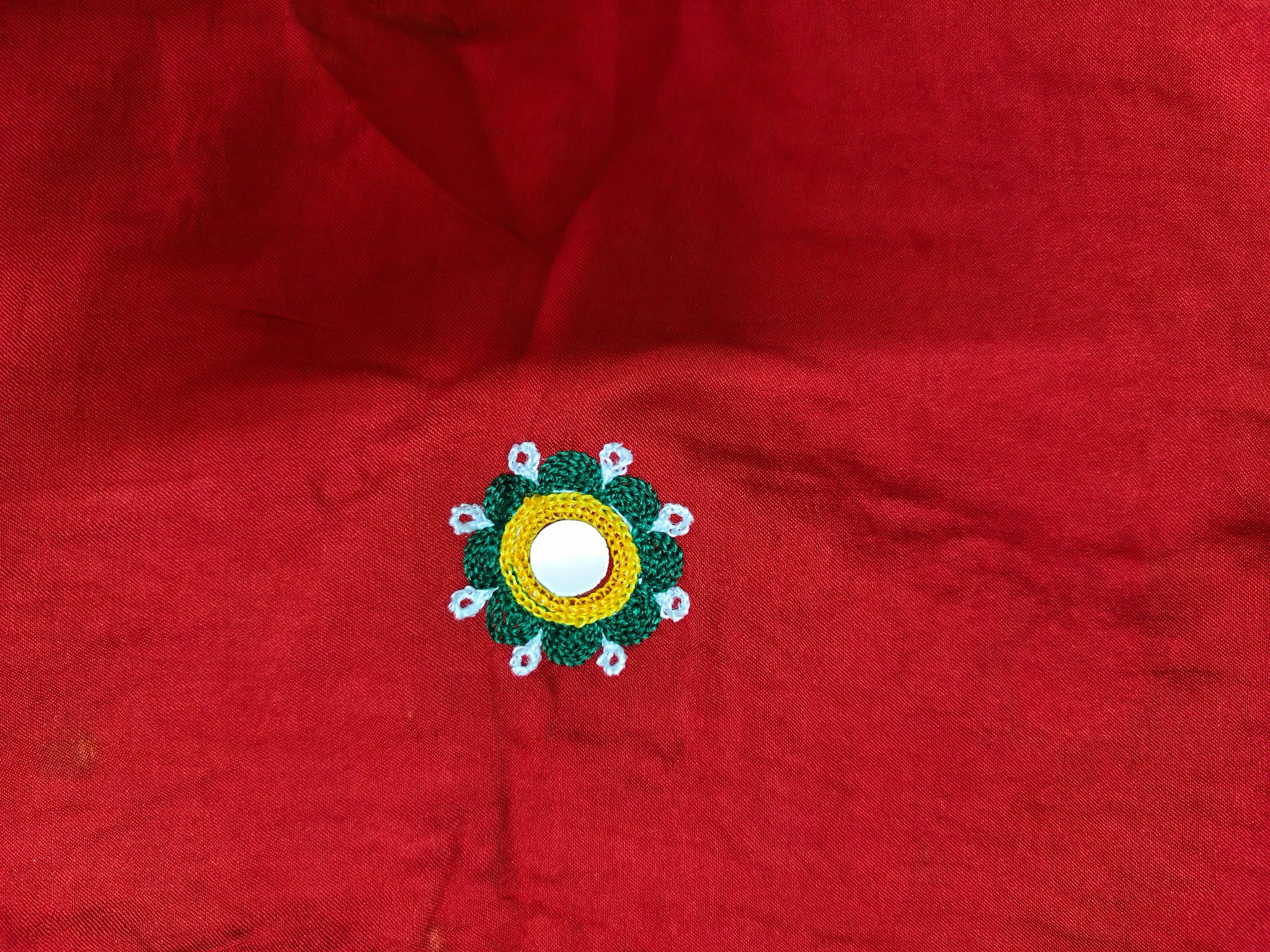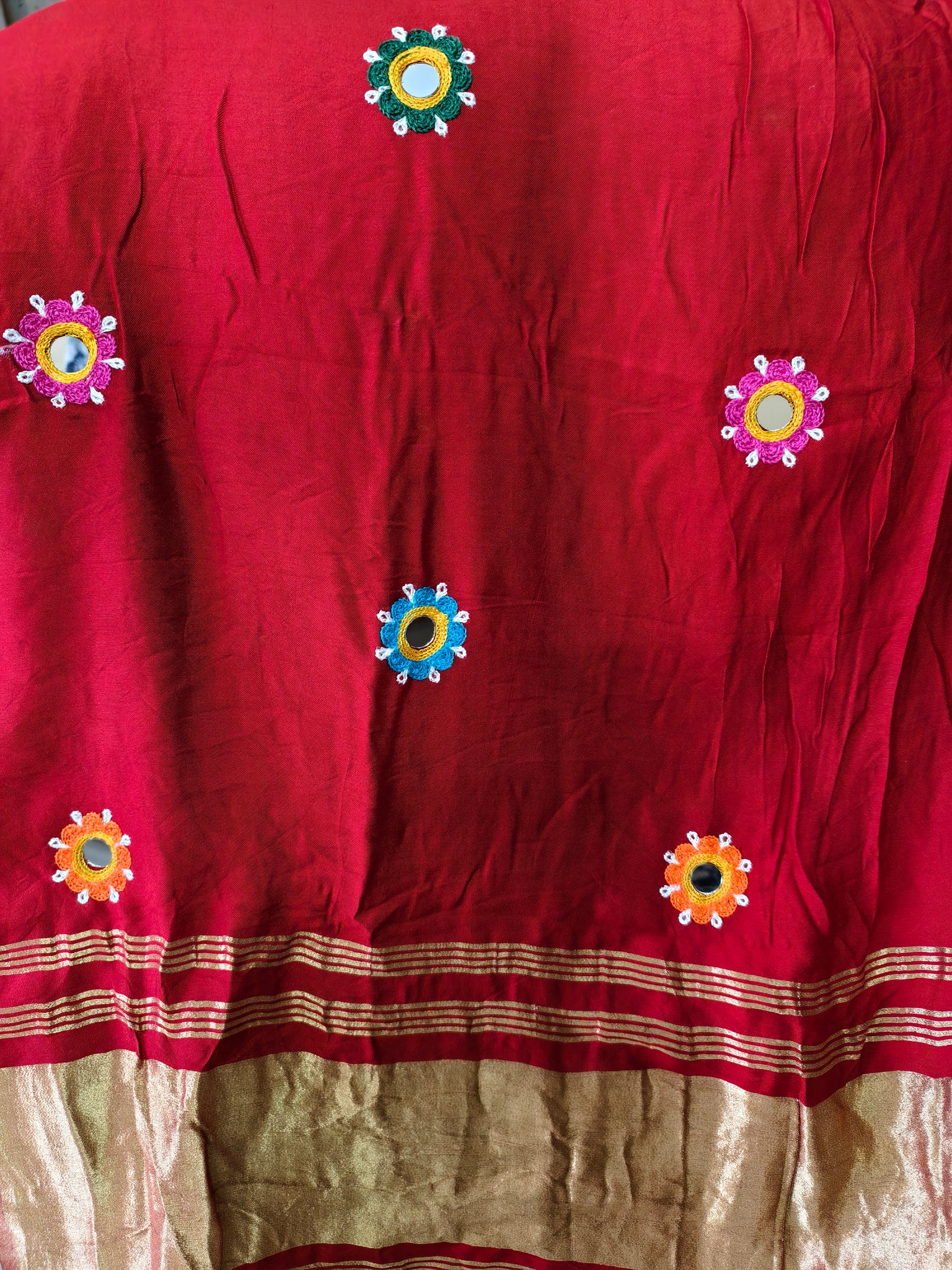 A timeless classic for the ethnic wardrobe. This lustrous red dupatta captures the charm of traditional folk embroidery with its playful mirror-work motifs. Each mirror is delicately hand-framed with colorful threads, creating a beautiful contrast against the rich crimson base.